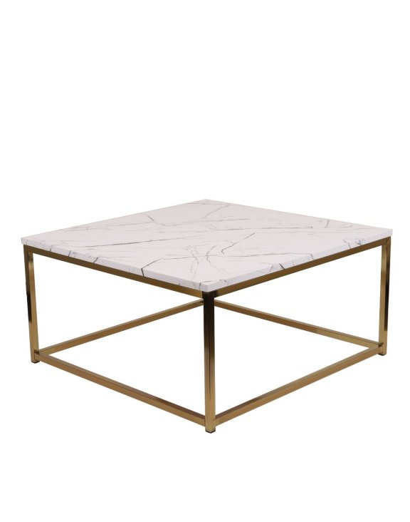 Desku stolku zdobí efektní mramorový vzor v bílé barvě, vyrobený z vysoce kvalitní laminované desky. Tento detail odkazuje na glamour styl a dodává celku luxusní vzhled.