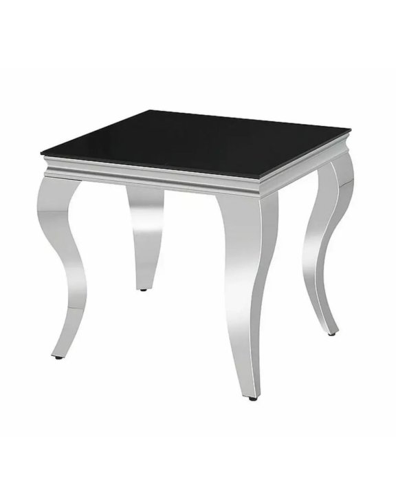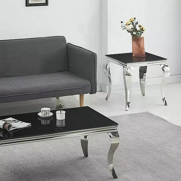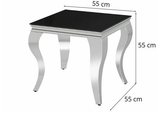 Jeho čtvercová deska z černého tvrzeného skla a zakřivené chromované nohy ve stylu glamour z něj dělají jedinečný kousek nábytku, který skvěle zvýrazní charakter interiéru.
