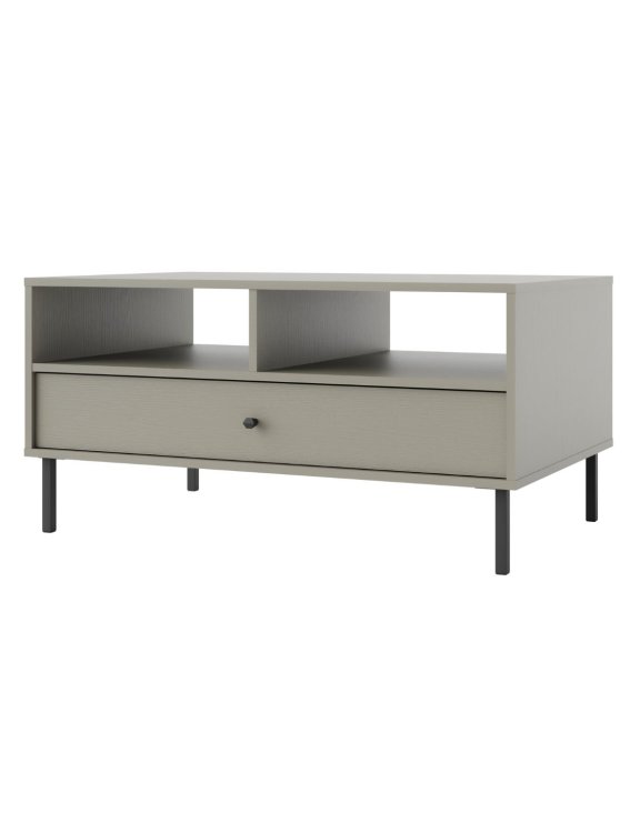 Stolek je vybaven prostornou zásuvkou na kuličkových pojezdech a otevřenými policemi, které umožňují pohodlné uložení ovladačů, časopisů nebo drobných doplňků.