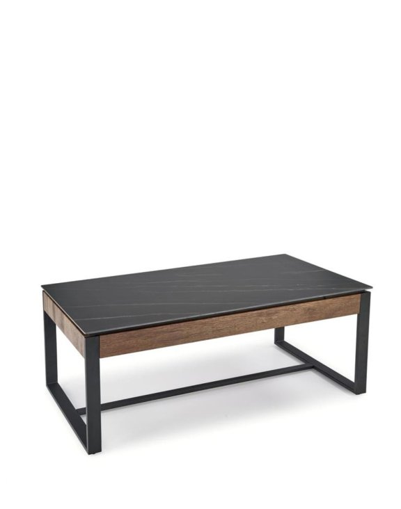 Obdélníková deska, připomínající černý mramor, v kombinaci s černým rámem a ořechovým dřevem tvoří jednoduchou a efektivní kompozici, která je nejen velmi funkční, ale také vizuálně atraktivní.
