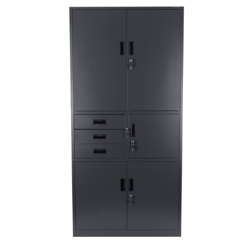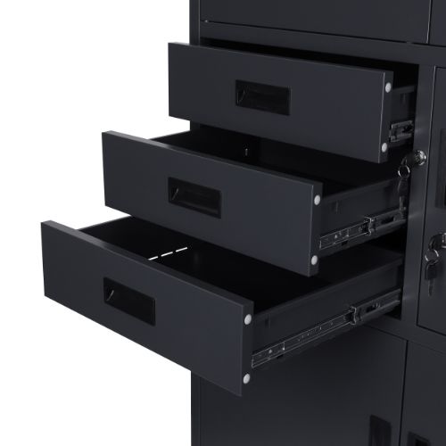 Kovová skříň Brooklyn v antracitové barvě značky Storfy je multifunkční model s uzamykatelnými skříňkami a zásuvkami a se šifrovaným trezorem.