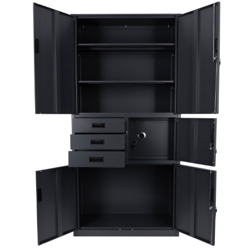 Menší část skříně tvoří tři prostorné zásuvky určené na drobné nástroje nebo kancelářské potřeby a vedle se nachází šifrovaný trezor ukrytý za uzamykatelnými dvířky.
