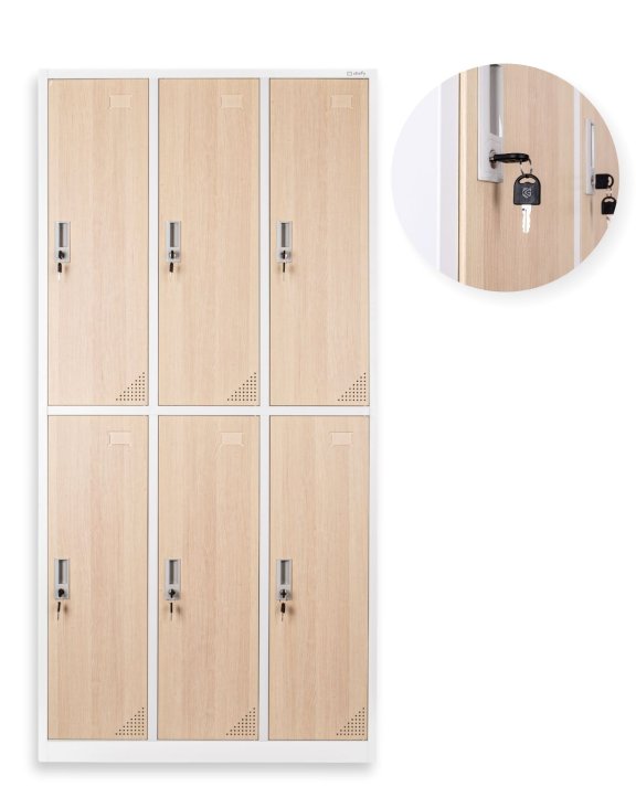 Skříň je vybavena 6 oddělenými schránkami, každá má vlastní zámek a dva klíčky v sadě, což zaručuje soukromí a bezpečnost uložených věcí.