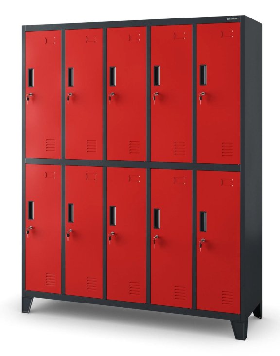 Kovová skříň má 10 vertikálních skříněk a každá je uzamykatelná kulatým zámkem se dvěma klíči.