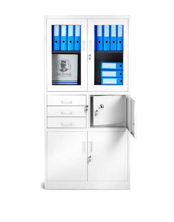 Kovová skříň Filip s trezorem v bílé barvě, je nábytek splňující nejrůznější potřeby všech uživatelů.