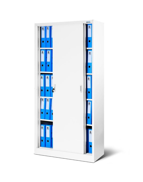 Kovová skříň s posuvnými dveřmi KUBA v bílé barvě vyniká svou funkčností, odolností a vzhledem.