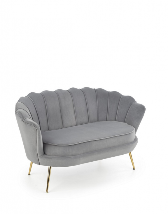 Měkké čalounění příjemně koresponduje se zlatým rámem. Skládá se ze čtyř štíhlých kovových nohou.