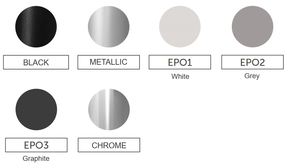 Kovová podnož je dostupná v 6 barevných variantách: černá, metalická, bílá (EPO1), šedá (EPO2), grafitová (EPO3) a chrom. Všechny varianty jsou zahrnuty v ceníku produktu.