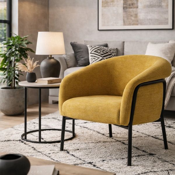 - Křeslo stojí na černých kovových nohách, které zajišťují stabilitu a zároveň dodávají modelu lehkost a moderní design.