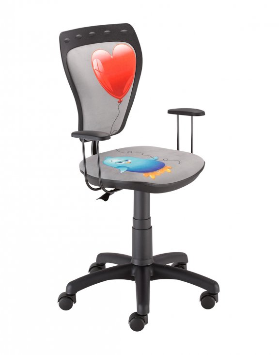 Dětské otočné křeslo s čalouněným sedákem a profilovaným čalouněným opěradlem.