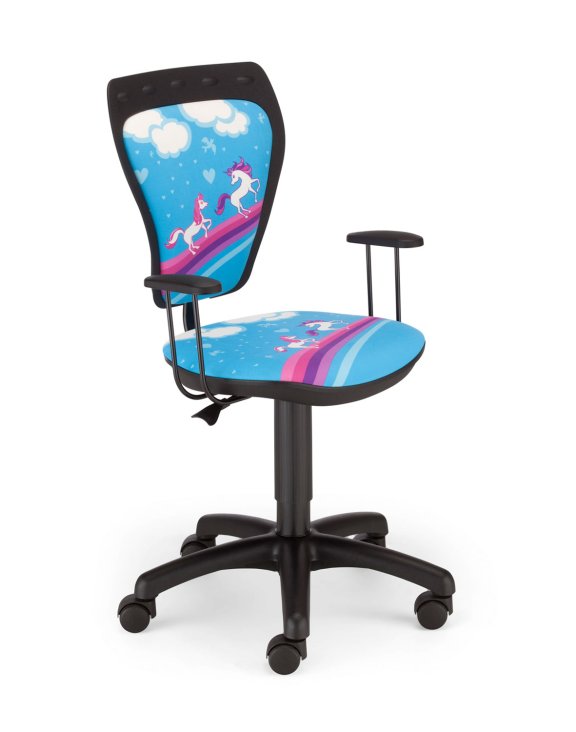 Dětské otočné křeslo s čalouněným sedákem a profilovaným čalouněným opěradlem.