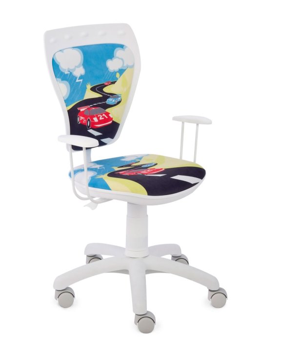 Dětské otočné křeslo s čalouněným sedákem a profilovaným čalouněným opěradlem.