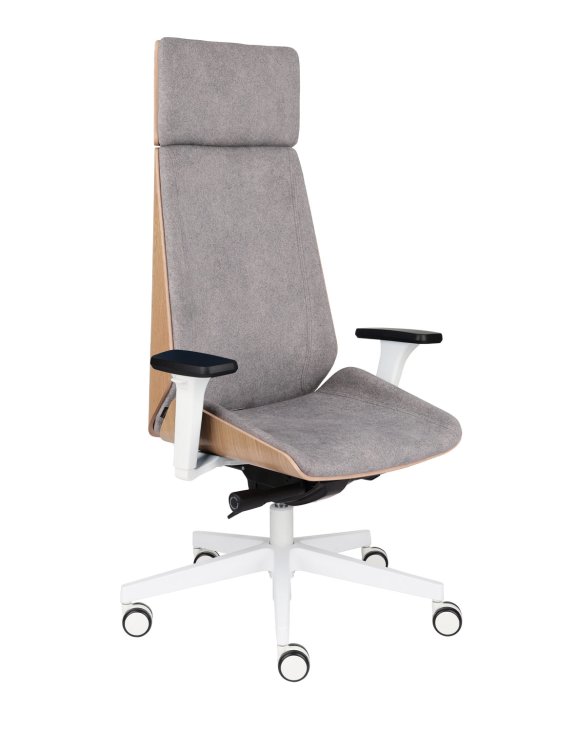 Nová verze populárního křesla Moon Wood - HD White, dubová dýha od značky Grospol s bílou konstrukcí a vybavená pohodlnou hlavovou opěrkou.