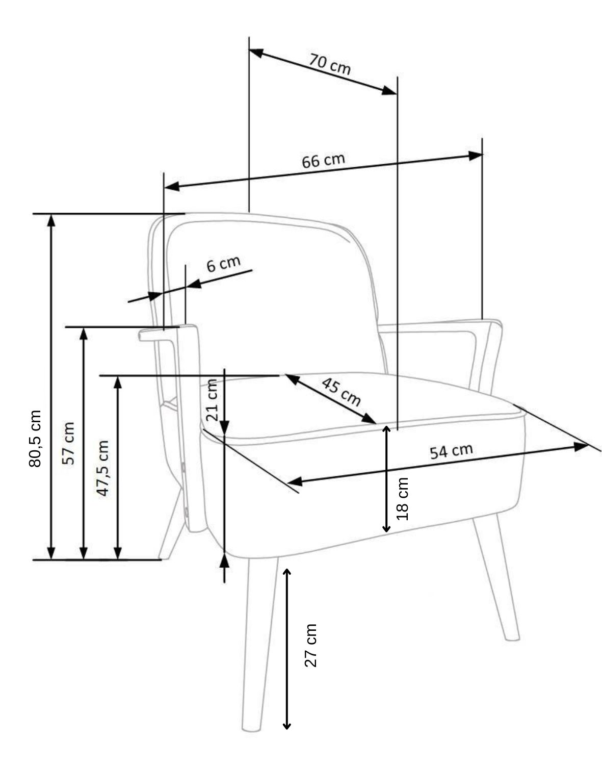 Rozměry: šířka sedáku 66 cm, hloubka 69 cm, celková výška 80,5 cm, výška nohou 27 cm.