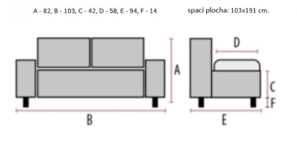 Funkce spaní – rozkládací na lůžko o rozměrech 103 × 191 cm.