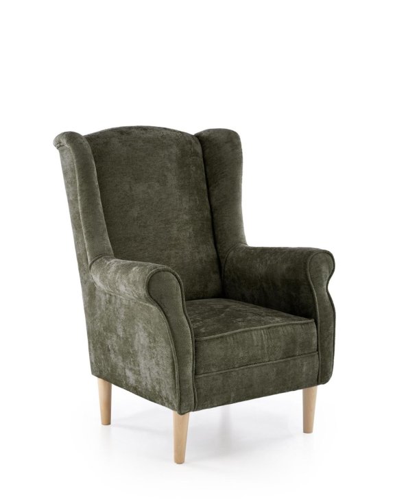 Čalounění z příjemné tkaniny Markos 12 v olivovém odstínu dodává křeslu jemnou eleganci a vnáší do interiéru útulnou atmosféru.