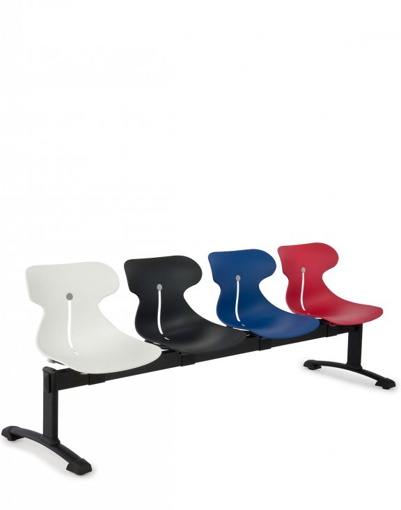 Čtyřmístná lavice na černé ocelové konstrukci s jasně profilovanými sedáky,