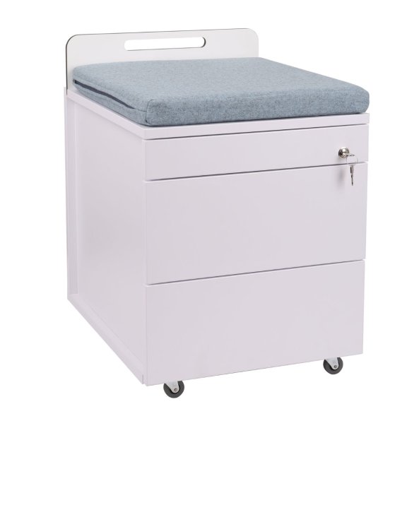 Kontejner má dvě kovové, hluboké zásuvky a jednu horní zásuvku typu „penál“. Zásuvky se otevírají pomocí bočního výřezu na čele nábytku.
