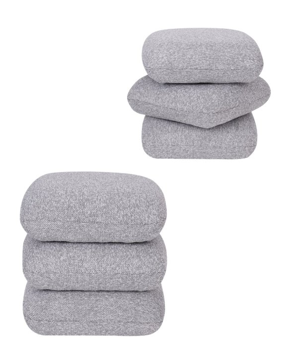 Taburet je čalouněn kvalitní strukturální látkou v elegantním šedém odstínu. Látka má výraznou, hmatatelnou vazbu, která dodává hloubku a texturu. Je příjemná na dotek, odolná a vhodná pro každodenní používání.