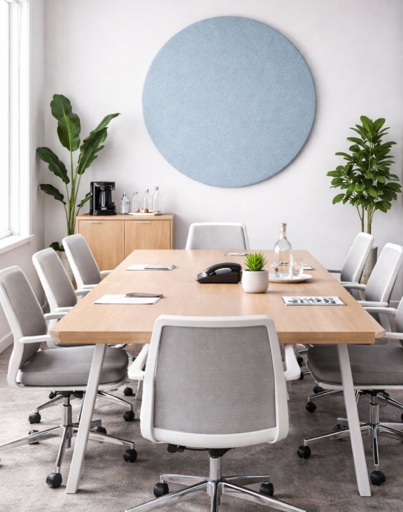 Kruhový formát 100 × 100 cm, široká paleta potahových látek a precizní zpracování zajišťují vysokou účinnost pohlcování zvuku v kombinaci s elegantním vzhledem.