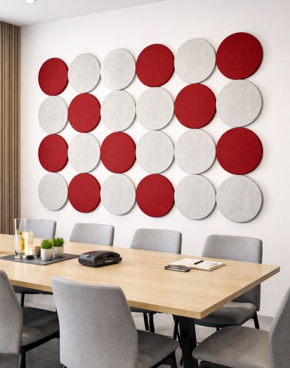 Kruhový formát 35 × 35 cm, široká paleta potahových látek a precizní zpracování zajišťují vysokou účinnost pohlcování zvuku v kombinaci s elegantním vzhledem.