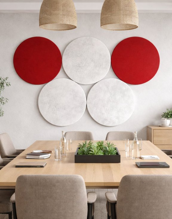 Kruhový formát 50 × 50 cm, široká paleta potahových látek a precizní zpracování zajišťují vysokou účinnost pohlcování zvuku v kombinaci s elegantním vzhledem.