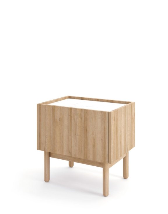 Jednoduchý, ale výrazný tvar je hlavní předností tohoto nočního stolku, zejména díky desce v dekoru mramoru bianco.