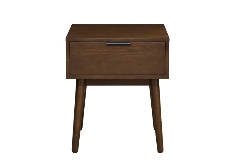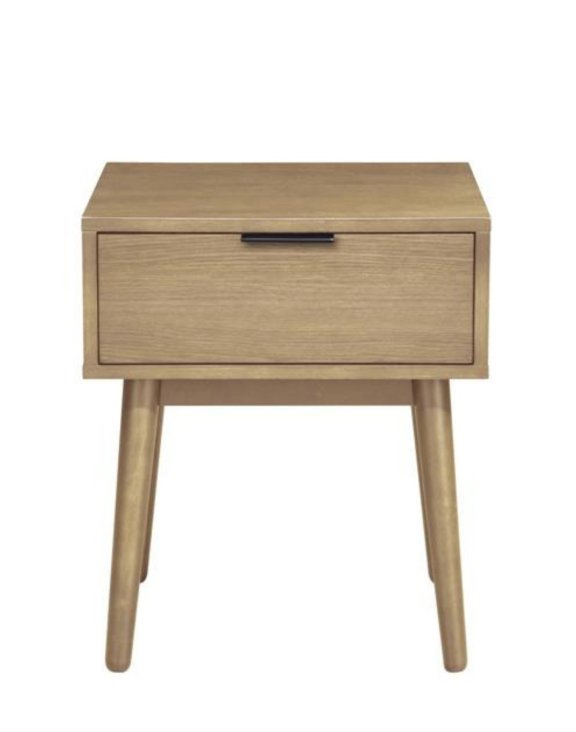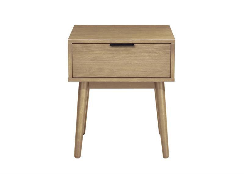 Horní část a zásuvka jsou vyrobeny z dýhovaného MDF desky, zatímco nohy jsou vyrobeny z masivního kaučukového dřeva v barvě přírodní nebo ořech.