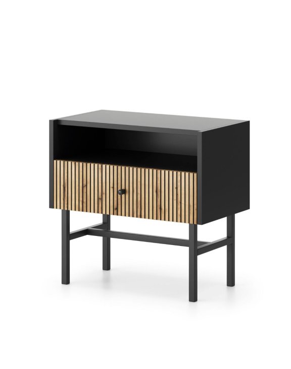 Stolek má černou konstrukci a originální lamelové čelo v barvě přírodního dřeva.