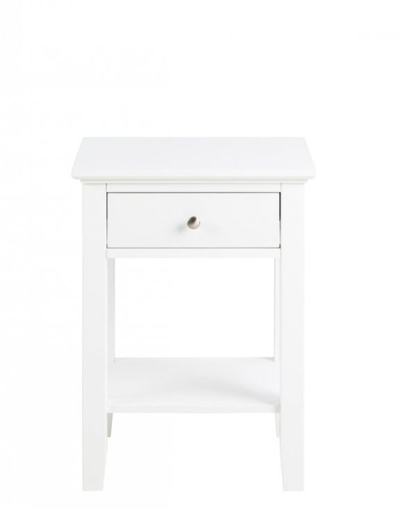 Skříňka je vyrobena z bílé MDF desky s jednou zásuvkou a policí, na kterou si můžete položit svou oblíbenou knihu.