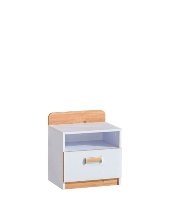 Noční stolek Lorento L12 se skvěle hodí do studentského, dětského pokoje nebo ložnice. Jeho funkční konstrukce spojuje praktičnost úložného prostoru s atraktivním designem. Kombinace bílé barvy s dekorem dřeva dodává nábytku lehkost a zároveň útulnost, díky čemuž jej lze snadno sladit s různými styly interiéru – od moderních po klasické.