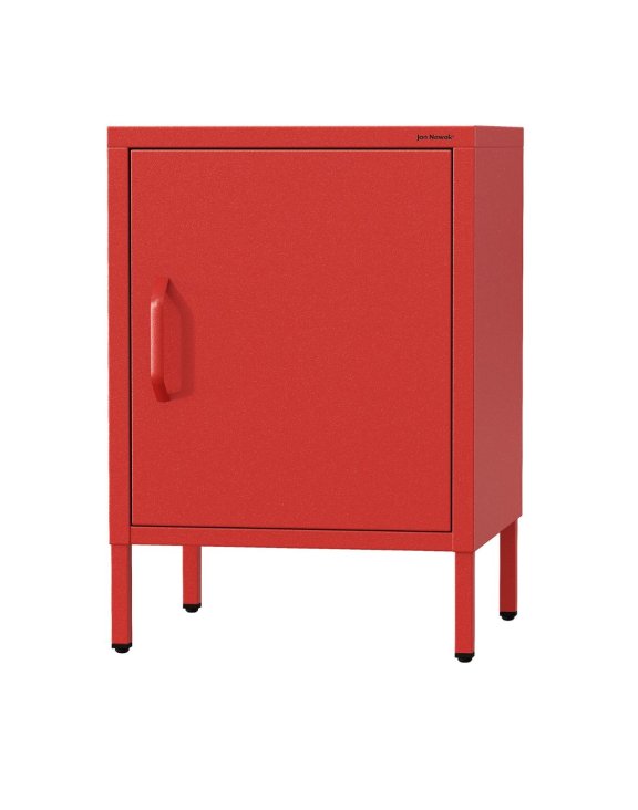 Kovový noční stolek MIA v červené barvě. Jeho unikátní design a praktičnost jsou dvě neoddiskutovatelné přednosti.