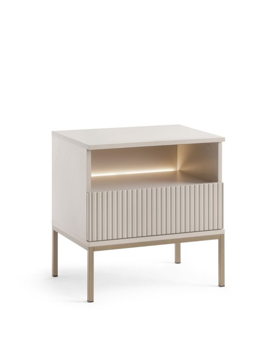 Noční stolek Sento (S54) značky Piaski s LED osvětlením v kašmírové barvě je elegantní a funkční kus nábytku, ideální do ložnice inspirovaný moderním stylem.