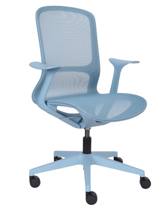 Sedák a vysoké opěradlo jsou vyrobeny z odolné a pružné síťoviny v pastelově modré barvě.