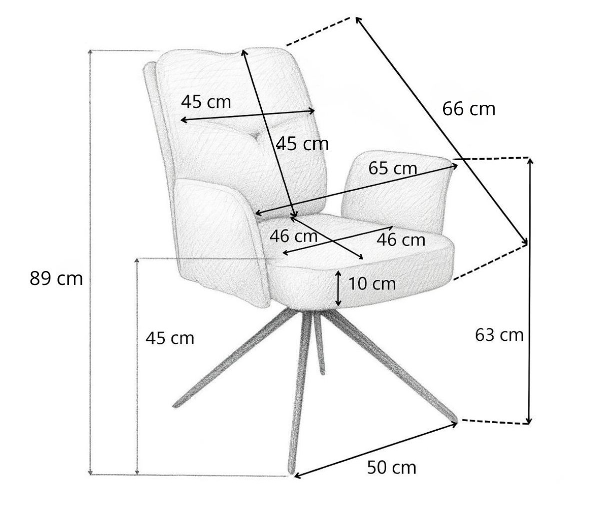 Rozměry: šířka od područky k područi 65 cm, hloubka sedáku 46 cm, celková hloubka 66 cm, výška 89 cm, výška k sedáku 45 cm.
