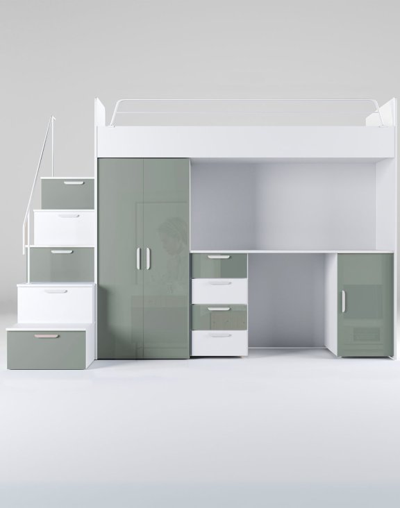 Sestava nábytku Raj 4 je komplexní systém typu „vše v jednom“, navržený pro maximální využití prostoru v dětském nebo studentském pokoji.