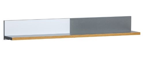 Police zaujme zajímavou kombinací barev – kontrastní spojení bílé, šedé a teplého odstínu dřeva jí dodává eleganci i jemný charakter.