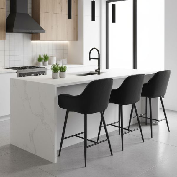 Měkké sametové čalounění Bluvel v černé barvě a pevná kovová konstrukce v černém matu vytvářejí stylový a odolný kus nábytku vhodný do kuchyně, jídelny nebo baru.