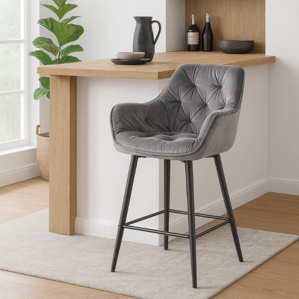 Měkké sametové čalounění Bluvel v šedé barvě a pevná kovová konstrukce v černém matu vytvářejí stylový a odolný kus nábytku vhodný do kuchyně, jídelny nebo baru.