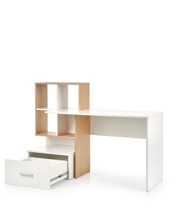 Psací stůl Grosso značky Halmar je harmonickým spojením teplého odstínu dubu zlatého s bílou a praktickými řešeními.