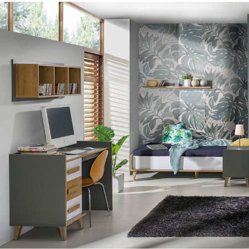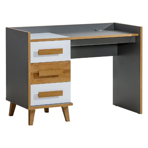Stůl zaujme jedinečnou kombinací barev – matné šedé, bílé a přírodního odstínu dřeva. Tato kombinace z něj činí ideální volbu jak do moderní kanceláře, tak do útulné domácí pracovny, studentského pokoje nebo koutku na učení.