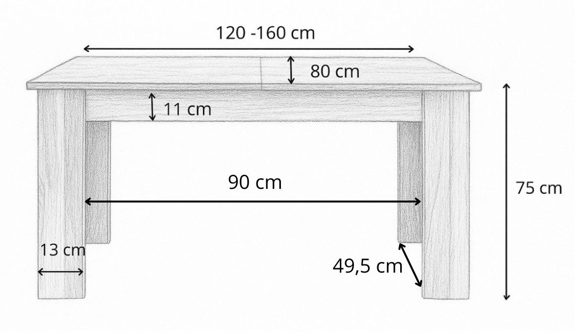 Rozměry: délka desky 120 cm, šířka 80 cm, výška 75 cm, tloušťka desky 2 cm, stůl s jednou vložkou 160 cm, tloušťka nohou 13 cm, šířka vložky 40 cm, šířka nosníku pod deskou 11 cm.