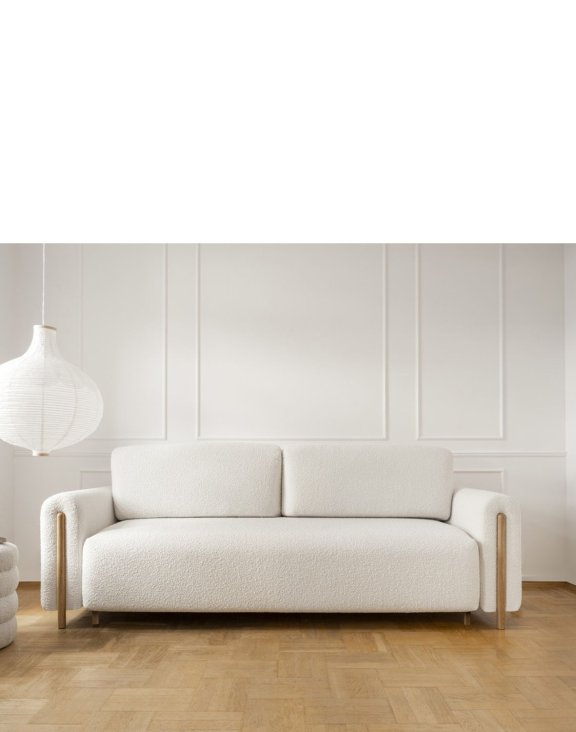 Vysoké dřevěné nohy v dubovém odstínu dodávají pohovce lehkost a umožňují její snadné zapadnutí do různých stylů interiéru. Charakteristické boky, krásně zdobené a funkční, jsou výjimečným prvkem, který přitahuje pozornost a dodává místnosti jedinečný charakter.
