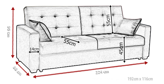 Rozměry: Šířka 224 cm, výška 90 cm, hloubka 88 cm. Výška sedáku 45 cm, hloubka sedáku 55 cm.