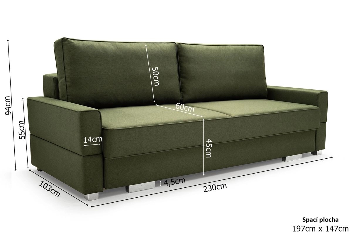Rozměry: Šířka 230 cm, výška 94 cm, hloubka 103 cm.