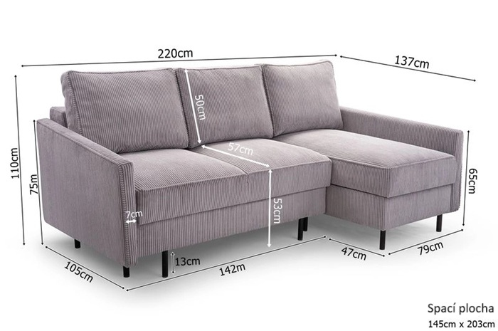 Vybaveno dvěma úložnými prostory na lůžkoviny a funkcí rozkládání s plochou 145x203 cm, poskytuje další úložný prostor a pohodlné místo na spaní.