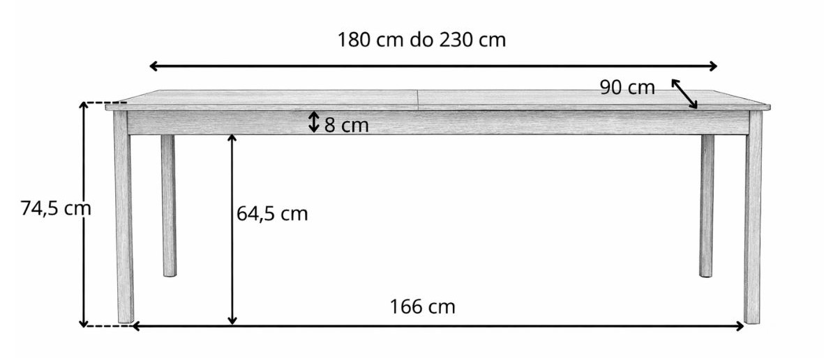 Rozměry: šířka 180 cm - 230 cm, hloubka 90 cm, výška 74,5 cm, výška od země k liště desky stolu pod stolem je 64,5 cm, tloušťka desky stolu 2 cm, šířka mezi nohama 166 cm (vejdou se 3 židle).