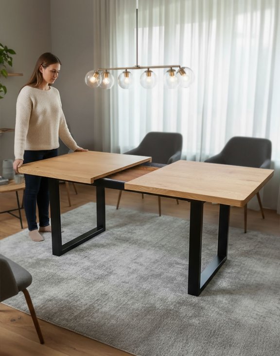 Stůl Grand M Plus vyniká také svou praktičností – díky rozkládacímu mechanismu lze jeho délku zvětšit ze 160 cm až na 200 cm, což oceníte při rodinných setkáních i větších oslavách.