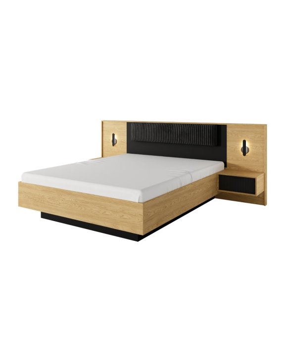 Moderní postel Baltic C 160×200 – spojení teplého dubu a černé. Dřevěný rošt v ceně, volitelný úložný prostor, kovové nohy a industriální design.
