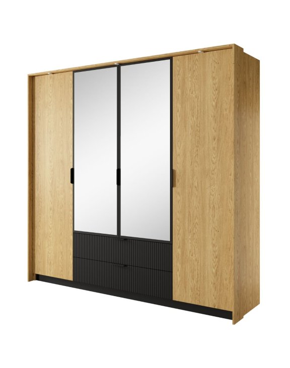 Moderní sestava Baltic spojuje teplý odstín dubu s černými akcenty. Styl, pohodlí a evropská kvalita v elegantním ložnicovém kompletu.